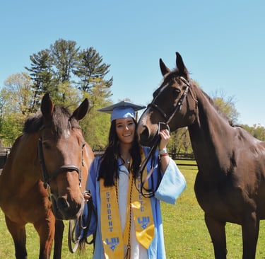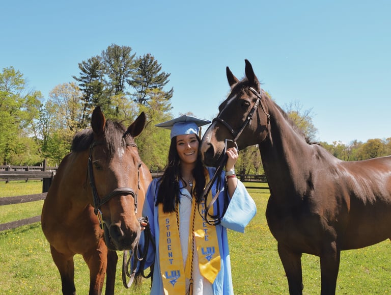 Jackie's passion only grew as she aged. She attended Long Island University where she was barn manager and captain of the division one equestrian team. In college Jackie continued to compete, she received numerous accolades including ; Zone 2 Region 4 Cacchione Cup, High Point Open Rider, and was reserve champion in multiple classes at Zone Finals. Jackie also ranked amongst great company in IHSA Regional finals, Zone Finals and National finals. She graduated LIU in 2022 with a Bachelor of Science degree in Pre- Veterinary medicine and Veterinary Technology.